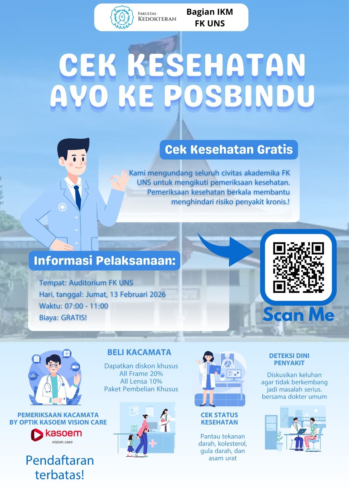 Skrining penyakit diperlukan agar masyarakat lebih sadar dengan kondisi kesehatan tubuhnya. Oleh karena itu, Bagian IKM-KP kembali melakukan Posbindu Institusi pada Jumat, 13 Februari 2026, bertempat di Auditorium FK UNS. Posbindu ini menjadi kegiatan pertama Posbindu yang dilaksanakan di tahun 2026. Seperti Posbindu yang telah terlaksana sebelumnya, Bagian IKM-KP pada Posbindu kali ini berkolaborasi dengan pihak luar. Kali ini, Bagian IKM-KP melakukan kolaborasi dengan dosen serta klini dari Bagian Kesehatan Mata (Ophtalmologi) FK UNS. Selain itu, Posbindu kali ini juga mendapatkan kesempatan bekerjasama dengan Optik Kasoem Surakarta.